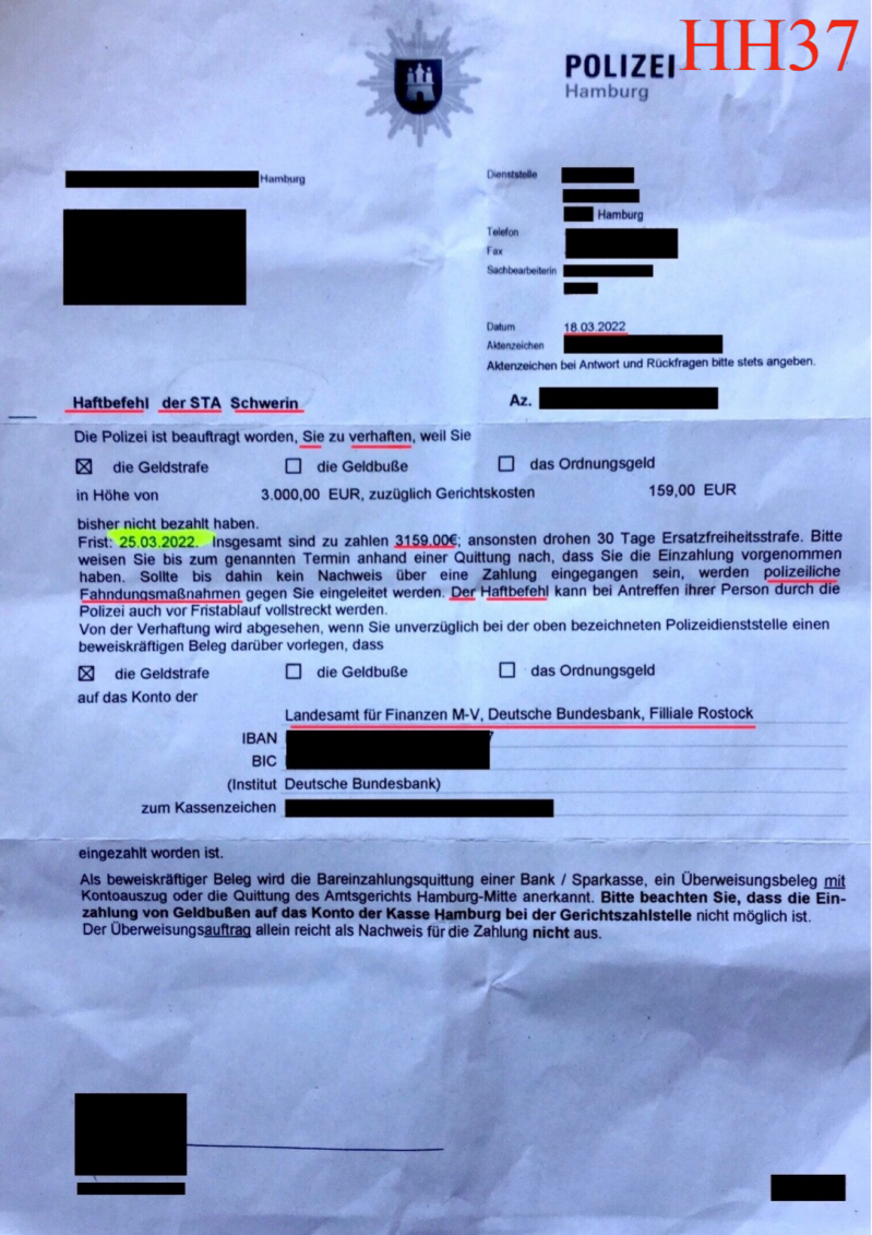 Proof: (original text): Mr. ... is prevented due to unfounded enforcement orders (threats of imprisonment) and unclear legal issues, the alleged justification of which is not disclosed to him by the competent authority either, because the underlying legal issues remain uncleared. Mr. ... doesn't get any information either.