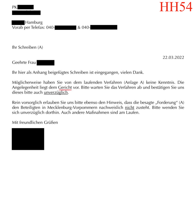 (HH54: Dear Ms., you may not be aware of the current procedure (enclosure). Please wait and confirm this to us immediately. We would like to point out that those involved from Mecklenburg-Western Pomerania (Former GDR) are not entitled to the above-mentioned claim. Please contact them immediately. Other measures are also in progress.)