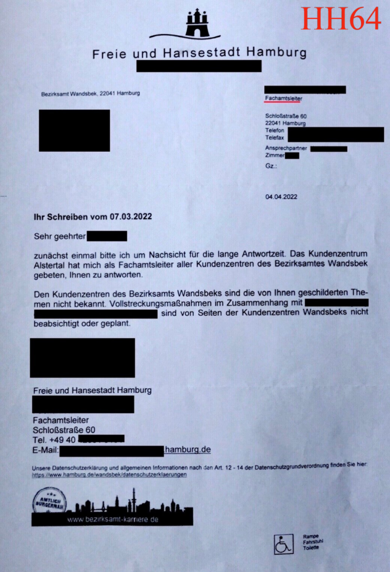 After receiving the above letter (HH64) you immediately get in touch with those involved around Ms. Guhl and Co. form the Alstertal customer center.